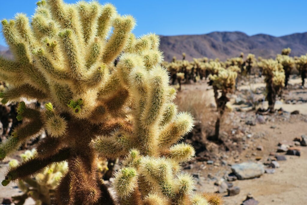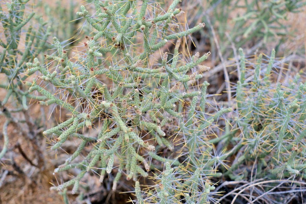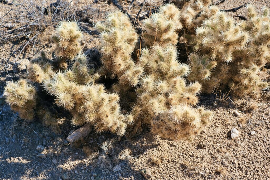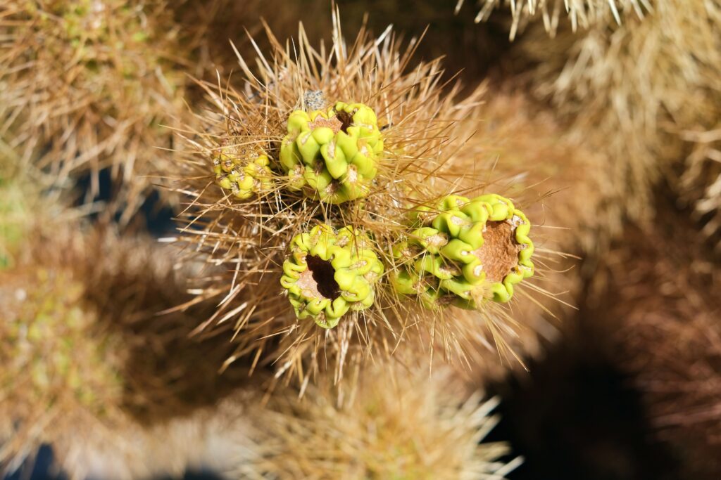 As you get closer, you’ll notice that the cactus isn’t hairy, but rather covered in spines. These will stick to your skin at the slightest touch. The spines on cholla cacti are difficult to remove once they’ve attached themselves to something (or someone). This defense mechanism is effective for desert survival, but it can be a bit of a pain for those who don’t stick to the trail.