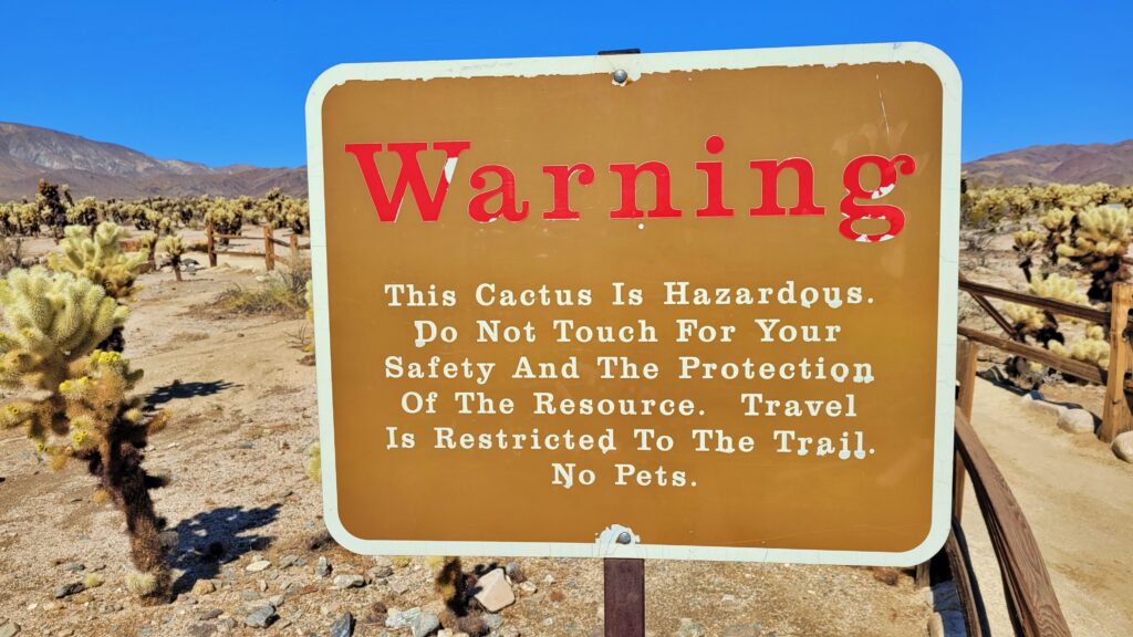 There are thousands and thousands of Cholla cacti growing in this garden. So be careful to stay on the path! Although you can easily walk the path in less than 30 minutes, allow an hour to appreciate all the fantastic views of the cacti.